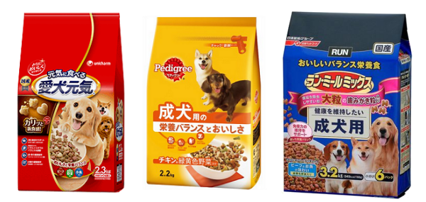 この中で特に目立つのはユニ・チャームが販売しているドッグフード。銀のさらやゲインズパックン、ベストバランス、グラン・デリ、愛犬元気の5種がそれにあたります。